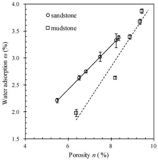 Figure 6 shows the relationship between porosity and water absorption of these specimens after different wetting-drying cycles, which indicates that the water absorption and the porosity have a good linear relationship (Equations (5) and (6)) in both sandstone and mudstone specimens.