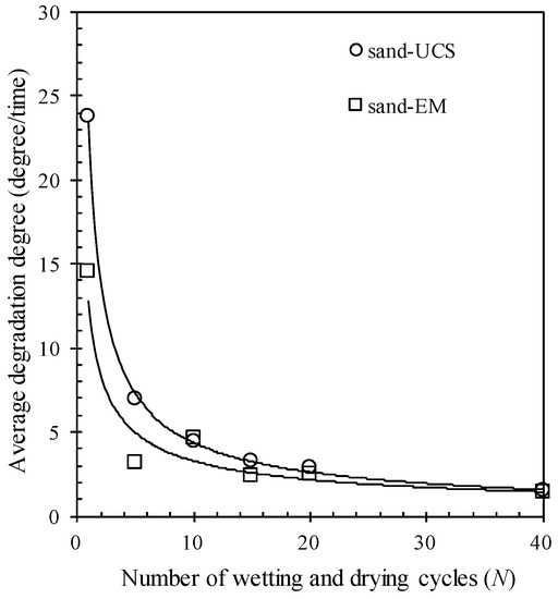 - While using the average degradation degree (AD) to describe the degradation degree of every wetting-drying cycle, it is found that as the value of N increased, the AD of EM and UCS decreased.