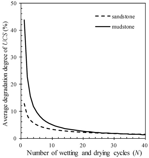 It was clear that the degradation rate of mudstone (r = 16.102) was larger than that of sandstone (r = 14.548). Obviously, the effects of cyclic wetting and drying on the UCS and EM of mudstone were more intense than that of sandstone. Gautam et al. [30] indicated that rocks with higher clay contents slake more rapidly and extensively than those with lower clay contents. As is known, mudstone is a fine-grained sedimentary rock, and its original constituents were clays or muds, while most sandstone is composed of quartz or feldspar.