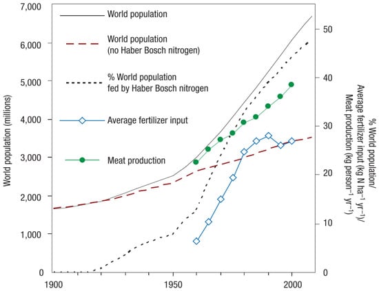 Figure 1. Human population growth with the increase of nitrogen usage from 1900 to 2008. Reprinted by permission from Springer Nature, Nature Geoscience, “How a century of ammonia synthesis changed the world”, Jan Willem Erisman et al. [9], [COPYRIGHT] (2018).
