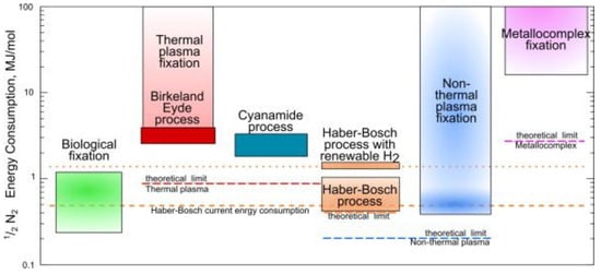 Figure 2. Energy consumption of different nitrogen fixation processes. Reprinted from Chemical Engineering and Processing, 90, N. Cherkasov et al., “A review of the existing and alternative methods for greener nitrogen fixation” [22,24,25,26,27,28,29,30,31,32,33], Copyright (2018) with permission from Elsevier B.V.