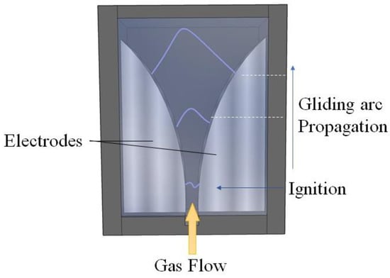 Warm plasmas, which include both thermal and non-thermal plasma conditions, have been used for nitrogen fixation, and progress regarding energy efficiency and product selectivity has been recently reported in the literature. Among the different reactor configurations, the gliding arc is the one that has been considered to be the most efficient and promising discharge type for gas conversion [61,62,63,64]. In particular, the use of this reactor type has also been extended to other systems like CO2 conversion and CH4 reforming [62,65,66]. The schematic diagram of a typical gliding arc reactor is shown in Figure 3. The arc, initially formed at the narrowest gap between electrodes, moves along the horn-shape electrode by the gas flowing towards the wider end of the gap until it extinguishes. After that, a new cycle starts with the arc formation at the narrowest gap again. The production of NOx has been reported in several previous works [67,68,69], and more detailed studies with special interest in energy efficiency, yield and reaction mechanisms were done recently. Wang et al. [53] investigated the NOx synthesis in a pulsed power gliding arc discharge through chemical kinetic modelling, and their results showed that the vibrational excited N2 can help overcome the energy barrier of the non-thermal Zeldovich mechanism O + N2(v) → NO + N, providing an energy efficient way to produce NO. The gliding arc reactor works in non-equilibrium conditions (maximum temperature of 1500 K), thus achieving much higher yields of NO when compared with the thermal process. Patil et al. [70] used a milliscale gliding arc reactor in their experimental study. Such milliscale configuration could reduce the volume of the gas that bypasses the arc, thus improving the contact between reactive species and gas molecules with a consequent increase in NOx production. The highest concentration of NO achieved in this study is close to 1%, with an energy efficiency of 10 kWh/kg of NOx. In a follow-up study [71], the NOx concentration was increased up to 1.4%, which is a promising concentration for container-size fertilizer production plant.