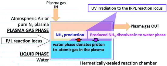 Figure 4. Plasma-liquid interfacial reaction locus with ultraviolet (UV) radiation for ammonia synthesis. Reprinted from “Non-catalyzed one-step synthesis of ammonia from atmospheric air and water”, Haruyama et al. in Green Chemistry issue 16, 2016 [128], Published by The Royal Society of Chemistry.