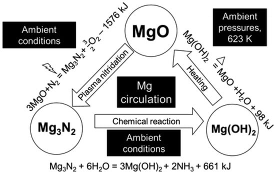 Figure 5. Plasma-assisted indirect synthesis of ammonia by using magnesium compounds. Reprinted by permission from Springer Nature, Plasma Chemistry and Plasma Processing, “Indirect Synthesis System for Ammonia from Nitrogen and Water Using Nonthermal Plasma Under Ambient Conditions”, Zen et al., [136], [COPYRIGHT] (2018).