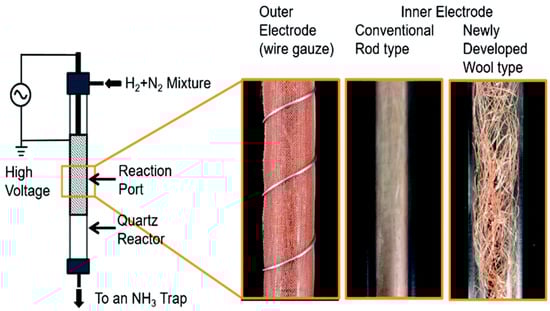 Figure 7. DBD reactor with wool-like electrode. Reprinted from “Remarkable catalysis of a wool-like copper electrode for NH3 synthesis from N2 and H2 in non-thermal atmospheric plasma”, Aihara et al. [116], in Chemical Communications, 2016, with permission from Royal Society of Chemistry.