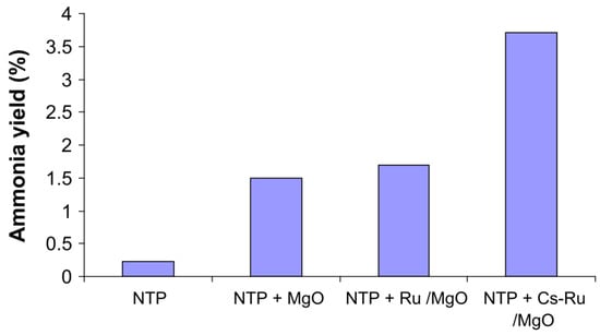 Due to the good performance in conventional ammonia synthesis process, Ru based catalysts have been selected as the reference n plasma-assisted process [101,115,121,150]. However, the ionization energy of Ru is 7.36 eV, and it might be difficult to be ionized by atmospheric DBD plasma. Therefore, a promoter such as Cs, which are easy to be ionized, was used to provide electrons to Ru for better catalytic activity [107,151,152]. Kim et al. [150] investigated the effect of promoters in their research, and the measured yields towards ammonia follow the trend of Mg > K > Cs > no promoter. In another research, Peng et al. [107] investigated the synergy between catalysts, supports and promoters. In their study, experiments were performed in four cases: supported catalyst with promoter Cs-Ru/MgO, without promoter Ru/MgO, only the support MgO, and plasma alone. A reproduction of their results is presented in Figure 8. Similar yields were achieved in the case of MgO and Ru/MgO, but an obvious enhancement was achieved when using a promoter. The authors suggested that the existence of MgO may enhance the surface discharge, which dissociates N2 and H2, hence increasing the ammonia production. This suggestion is in line with other investigations [104,117,122]. In this case, it is worth remarking that the presence of Cs greatly promoted the catalytic effect, doubling the ammonia yield. In this research, carbon nanotubes (CNT), active carbon (mesoporous) and MCM-41 were also used as support material in order to compare their effect. From the results it was concluded that with CNT the best efficiency of 2.2 g/kWh was achieved. On the other hand, when using MCM-41 as support, an efficiency of 1.7 g/kWh was achieved [121].