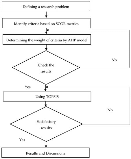 In this research, the authors proposed an MCDM model using hybrid of Supply Chain Operations Reference (SCOR) metrics, the Analytic Hierarchy Process (AHP) model, and the Technique for Order of Preference by Similarity to Ideal Solution (TOPSIS) approach for supplier evaluation and selection in the gas and oil industry. According to literature reviews on SCOR metrics, all criteria that influence the supplier selection are defined in the first stage, the AHP model is applied to determine the weight of each factor in the second stage, and the optimal supplier is presented by the TOPSIS model based on the positive ideal solution (PIS) [] and the longest geometric distance from the negative ideal solution (NIS) [] in the final stage.