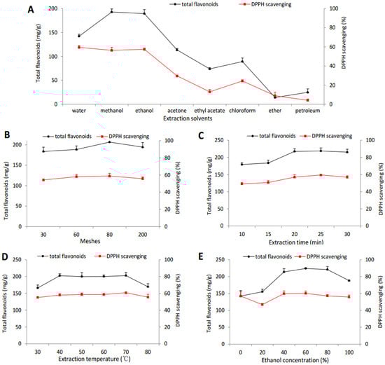 Influence of the main factors ((A) extraction solvents, (B) meshes, (C) extraction time, (D) extraction temperature, (E) ethanol concentration) on flavonoids and DPPH scavenging of Aurantii fructus.