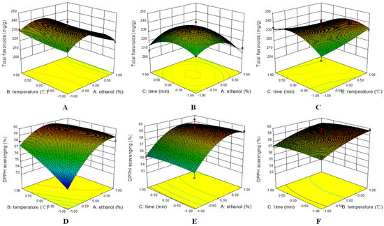 Response surface plots of ethanol concentration, extraction time, and temperature on the total flavonoids (A–C) and DPPH scavenging (D–F).