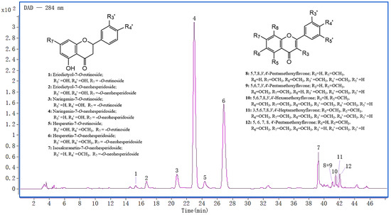 Representative chromatogram of flavonoids with antioxidant properties from ethanol extract of Aurantii fructus obtained using HPLC–DAD (λ = 284 nm) coupled with Q–TOF–MS.