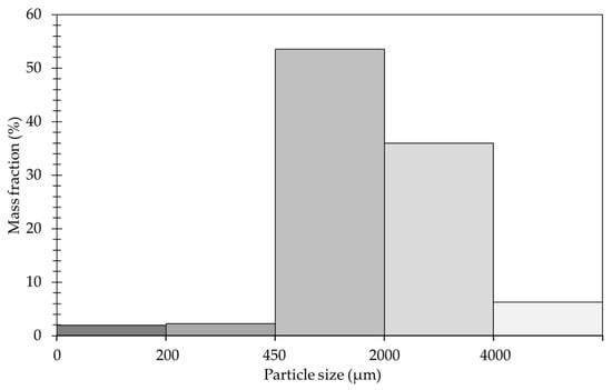 Red vine leaves (Vitis vinifera, DAKAPO GN7225-8 Deckrot x Portugieser Börner) were collected on 3 October 2014 in Geisenheim (RP), Germany, and dried at 75 °C for 48 h (UT6120, Heraeus Holding GmbH, Hanau, Germany). After drying, the red vine leaves were manually ground in a mortar using a pestle. The bruised red vine leaf powder was sieved into 3 fractions by riddle screens (Analysette 3 PRO, Frisch GmbH, Idar-Oberstein, Germany) with 200 µm, 450 µm, 2000 µm, and 4000 µm mesh sizes. Furthermore, the bulk densities were determined by filling a 10 mL measuring cylinder (Brand GmbH & Co KG, Wertheim, Germany) with 5 mL the red vine leaves and the filled measuring cylinder was weighed using an analytical balance (1702, Sartorius AG, Göttingen, Germany). The particle size distribution is displayed in Figure 1 and further details are given in Table 1. For measurements with undried red vine leaves a part of the collection was stored in a freezer (GS26DN11, Siemens AG, München, Germany) at a temperature of −18 °C. After defrosting, the red vine leaves were cut into 2 to 4 mm pieces by a scalpel. To maintain comparability with the dried red vine leaves the moisture content was calculated by weighing the undried red vine leaves and reweighing these red vine leaves after drying. The loss of water averaged 72.7 ± 3.7% in the course of 5 experiments.