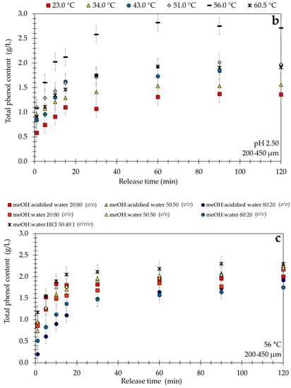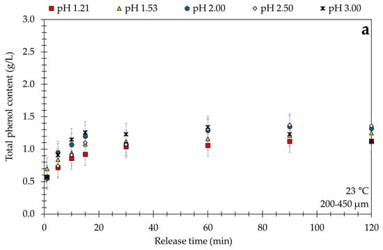 The study of Fossen et al. [63] revealed that pH values between 1.0 and 3.0 are most effective for the stability of anthocyanins, which are, like the flavonoids, a subgroup of polyphenols. Based on these results at 23 °C the pH values of 1.21, 1.53, 2.00, 2.50, and 3.00 were selected. Higher pH values were not applied due to the instability of polyphenols at higher pH values. As seen in Figure 2a, all leaching curves are very similar and acidity does not influence the extraction process significantly. The pseudo-equilibrium concentration is between and as shown in Table 2. The effective diffusion coefficient according to Equation (2) ranges from to , as the highest value of the effective diffusion coefficient was observed at a . However, after 60 min the total polyphenol content gradually decreases from to . This slight decrease indicates that the polyphenols at this condition are becoming unstable and are beginning to degrade. Türker et al. [64] investigated the extraction of anthocyanins from carrots and confirmed the lower stability at a pH value of 3.00 and higher stability at a pH value of 2.00. Due to these results and given the conditions producing related to the highest extraction yield of a pH value of 2.50 was chosen for further measurements.