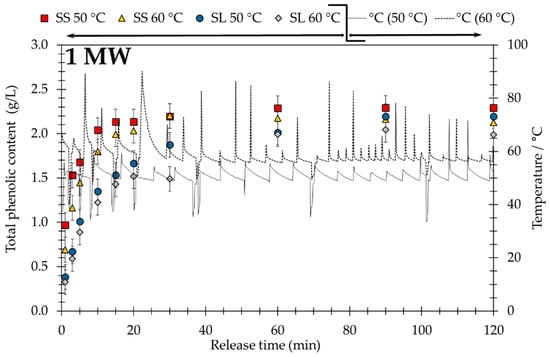 Based on the screening results the two different samples (SS and SL) were extracted in the microwave oven (MW) at 50 °C and 60 °C. Figure 3 (1 MW) depicts the extraction kinetics (the total phenol content on left axis) and measured temperature (right axis) during 120 min application time as full and dash lines. The results are in line with the laboratory robot results at 50 °C or 60 °C, and the short overshooting of the two-level controller (energy input of gives no obvious performance loss.