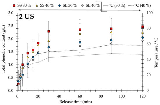 In comparison, the US probe with an amplitude of 30% gives a temperature around 50 °C whereas an amplitude of 40% raises the temperature to almost 60 °C, as depicted in Figure 4 (2 US). The slope of the measured temperature curves (full and dashed lines) follows the slope of the total phenol content curves. This indicates that only a portion of the cavitation bubbles break up the herbal cell membranes and the main energy of the compression waves heats up the extraction slurry and friction loss and limits the yield of polyphenols. It is apparent that changing the amplitude will not significantly improve the extraction.
