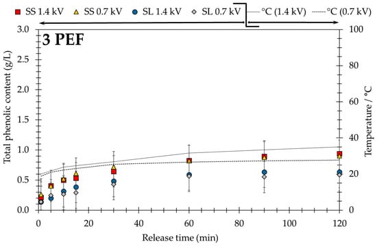 In contrast to MW and US, the PEF-assisted technique (see Figure 5, 3 PEF) increases the temperature of the extraction slurry up to 35.0 °C for and to 27.8 °C for due to Joule heating, although the input of electrical power from to is very high. As can be seen, the increase of temperature is dependent on the intensity of the electric field and on the treatment time [72]. As to this, the application of PEF assisted processes in combination with mild heating presents a promising technique for benign extraction of thermal sensitive solutes. As mentioned, the temperature rise is not dramatic and the pseudo-equilibrium is reached after 60 min. Additionally, in accordance to the screening experiments (pH value, temperature, and solvent) of the laboratory robot, no degradation of polyphenols is observed during 120 min of extraction time.