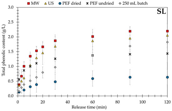 Although nonconventional processing techniques have different active principles, a comparison using the large red vine leaves (SL) is shown in Figure 6 and a conventional batch stirred vessel held at 50 °C is the reference. Generally, within 60 min extraction time the MW-, US-, or PEF-assisted technique achieved a higher yield of polyphenols than the standard extraction process. An exception is the PEF-assisted extraction process using dried red vine leaves. The lower effectiveness of PEF assisted extraction technique can be understood in context of the properties of the dried red vine leaves. It is harder to overcome the transmembrane potential and create pores, which is confirmed by the results of PEF with dried plant material and undried plant material. After harvesting and drying, the red vine leaves not only lose their moisture, especially the intracellular fluid, but also the structural integrity of the cell membrane pores is possibly damaged, which limits the effectiveness of PEF. In contrast, PEF assisted extraction of fresh red vine leaves leads to a total phenol content to (see Table 5). However, MW- and US-assisted extraction techniques are more effective [73] and temperature changes resulting from the energy input is the crucial factor for increasing yield. The MW-assisted extraction process achieves the highest total phenol content followed closely by the US-assisted extraction technique.