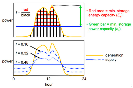 | fraction of electricity generation that is stored | Greater smoothing of generation peaks requires greater f (see Figure 3) | |||