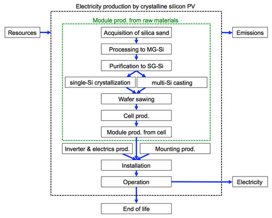 - Frischknecht, R.; Heath, G.; Raugei, M.; Sinha, P.; de Wild-Scholten, M.; Fthenakis, V. Methodology Guidelines on Life Cycle Assessment of Photovoltaic Electricity, 3rd ed.; IEA PVPS Task 12; National Renewable Energy Lab. (NREL): Golden, CO, USA, 2016.