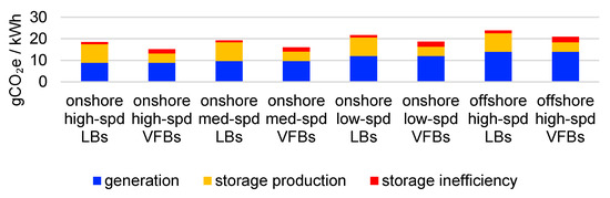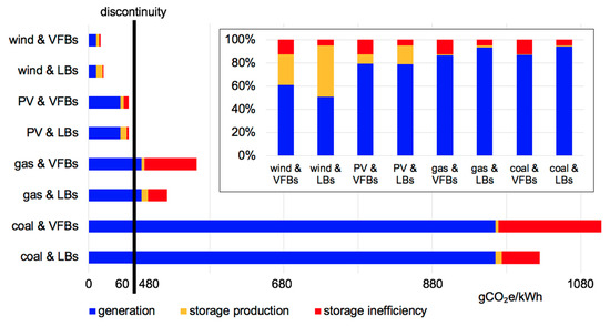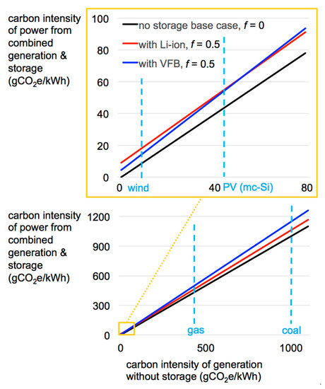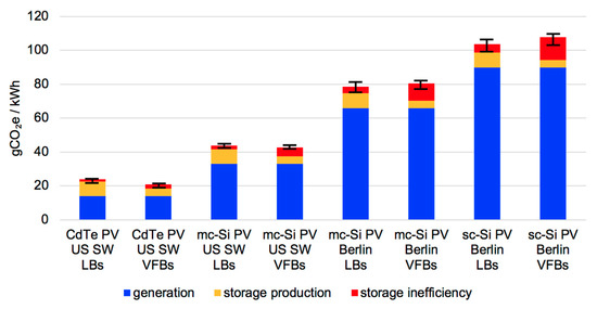 - In Table 2, the battery production emissions (es) do not include emissions from producing the battery inverter and control system, because of a lack of data. An alternative is estimating battery inverter emissions by approximating that the battery inverters are equivalent to PV inverters, and then using the PV inventories discussed in Section 2.2.1. [40,41]. These inventories report inverter production GHGs of ~27.4 gCO2e per watt of AC inverter capacity, and inverter lifetime of 15 years. For the cases analyzed in this paper, this would add approximately 1.5 gCO2e/kWh to the total carbon intensity, and increase the storage production emissions by ~15% for LBs and ~30% for VFBs. Unlike the battery inverter case, we do not identify a reasonable approximation for the emissions from producing the battery control system.