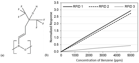 (a) Chemical structure of SXFA and (b) Normalized response to benzene of three different RFID sensors using SXFA as a sensing material [14,15] (RFID: radio frequency identification).