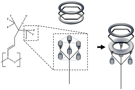 Since the benzene molecule is not parallel to the trifluoro-group on SXFA, benzene does not sorb to the trifluoro-groups in SXFA. Instead, benzene preferentially sorbs to the OH-group in SXFA. Due to benzene’s preference to interact with the OH-group instead of either of the trifluoro-groups, it can be concluded that the sensing mechanism proposed by Stewart and Penlidis [8] is incorrect. Rather than benzene π-stacking with one of the trifluoro-groups on SXFA, benzene is attracted to the OH-group in SXFA, as shown in Figure 3.