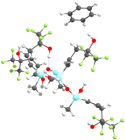 Initially, the complex of a single SXFA unit (a carbon chain with two trifluoro-groups and an OH-group) with benzene was evaluated. From there, short SXFA chains were evaluated, adding one SXFA unit at a time, up to four SXFA units. In all cases, and for both the B3LYP and M06 functionals, the benzene molecule oriented itself perpendicularly to the OH-group (see Figure 3) and not parallel to the trifluoro-group, as postulated by Stewart and Penlidis [8].