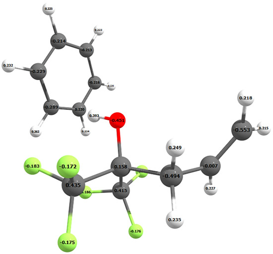 Although the NBO analysis resulted in larger charges on the oxygen and hydrogen atoms, both the Mulliken and NBO charges show the same trend. Both DFT analyses calculated negative charges on the carbon atoms of the benzene ring and resulted in benzene orienting itself perpendicular to the OH-group on SXFA (Figure 3 and Figure 4). Therefore, benzene adsorbs onto the OH-group of SXFA and not one of the trifluoro-groups.