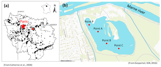 Localization of (a) Lake Champs-sur-Marne and (b) the different monitoring points.