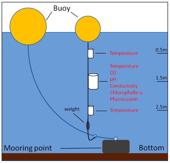 At each point, the continuous monitoring is performed at three depths using a set of different underwater sensors. The set of sensors is attached on a rope, which is fixed to a buoy at the water surface and stretched by a weight on the bottom side. The rope supporting the sensors is then connected to a second rope with a slipknot, allowing the sensors to stay at the same depth, while the slipknot can move according to currents and water level variations. The second rope is moored to the bottom by a heavy weight and fastened to another buoy at the water surface. Two thermal sensors are installed at 0.5 m and 2.5 m depths, whereas a multi-parameter sensor is located at 1.5 m depth for measuring water temperature, pH, conductivity, dissolved oxygen (optode), chlorophyll-a and phycocyanin (fluorescence). The in-situ monitoring design is presented in Figure 2.