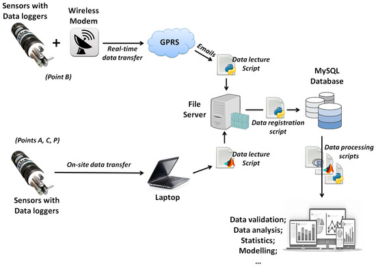 As presented in the above sections, on-site monitoring is conducted on four different points (A, B, C, P). Measurements are first recorded in on-site data loggers, and then transferred via two different schemes, such as (i) on-site data transfer and (ii) wireless real-time data transfer.