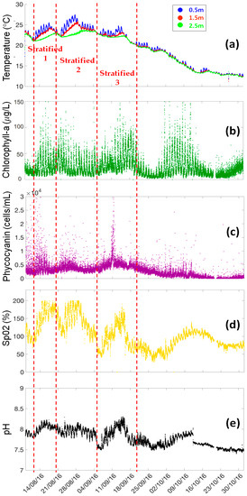 Variations of water temperature at three different depths (0.5 m, 1.5 m and 2.5 m) are shown in Figure 4a. In general, the water temperature ranges from 21.2 °C to 27.4 °C during 8th August and mid-September, then progressively decreases from 21.2 °C to 12.2 °C until the end of October. The lake is completely stratified during 3 periods from mid-August to mid-September, (12–20 August 2016; 22 August–4 September 2016; 5–17 September 2016), interrupted by three short mixing episodes (21–22 August 2016, 4–6 September 2016 and 16–18 September 2016). The difference between the surface and bottom water temperature reaches 4.8 °C at the end of August.