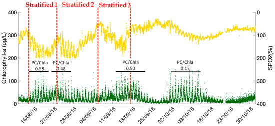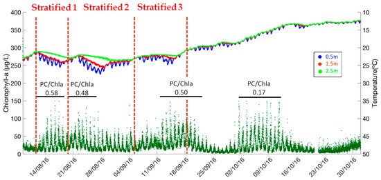 Chlorophyll-a fluorescence is used as a proxy of phytoplankton biomass, while phycocyanin fluorescence is described as a proxy of Cyanobacterial biomass in freshwaters [16]. The average ratio of phycocyanin to chlorophyll-a (µg chl-a/L/µg PC/L) is calculated for each phytoplankton bloom period (11–19 August 2016, 19–29 August 2016, 10–24 September 2016 and 29 September–17 October 2016) (Figure 5 and Figure 6). Similar values of PC/Chl-a ratio can be identified (0.58, 0.48, 0.50) for the phytoplankton blooms during warm periods when the water temperature was higher than 20 °C, (11–19 August 2016, 19–29 August 2016, 10–24 September 2016). On the contrary, this ratio is quite lower (0.17) for the phytoplankton bloom during the cooling mixing period (29 September–19 October 2016). A shift of the phytoplankton assemblage has probably occurred. Accordingly, the physical-chemical variables such as water temperature, dissolved oxygen, and pH alone cannot be considered as reliable indicators for the cyanobacteria blooms.