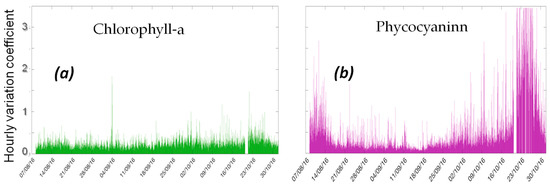 Our high-frequency monitoring platform was set-up to collect data each 5 min. In order to check the feasibility of a high-frequency monitoring station, less energy-consuming, more suitable to operational management, the hourly variation coefficients (HVC) of the measured values of chlorophyll-a and phycocyanin are calculated. The HVC is the ratio of the standard deviation to the average of the measured values over 1 h. The HVC variations of chlorophyll-a and phycocyanin are shown in the Figure 7.