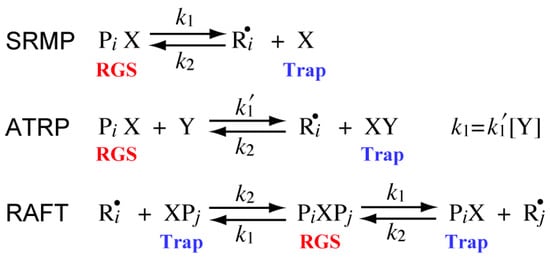 Reversible deactivation reactions in some of representative RDRP. In the figure, PiX or XPi is the dormant polymer with chain length i.  is the active polymer radical with chain length i.