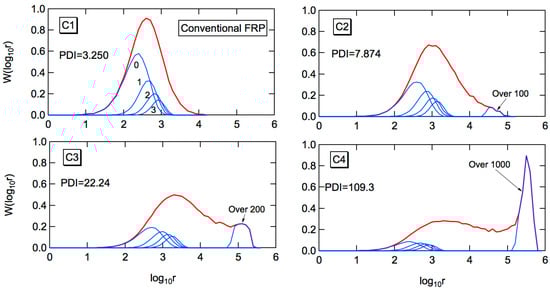 Weight fraction distribution determined by the MC simulation for the conditions, C1–C4. In the figure, PDI means the polydispersity index, defined by PDI = w/n. The PDIs are the theoretical values, with w being calculated from Equations (16) and (17).