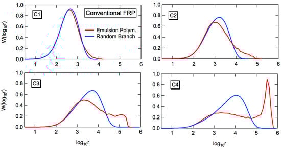 Comparison of the full weight fraction distribution profiles of polymers formed through the conventional emulsion polymerization for the conditions, C1–C4 (red) and the corresponding random branching (blue).