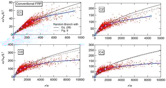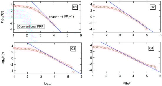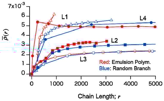 Figure 4 shows the log-log plot of the number fraction distribution, N(r). The power law holds for a significant range of chain lengths [,,]. The power exponent for the number fraction distribution, N(r) is −(1/Pb + 1), as shown in the figure. With the relationship, W(r) ~ rN(r), the power exponent of the weight fraction distribution, W(r) is −1/Pb, i.e., W(r) ~ r−α with α = 1/Pb. Because the branching probability, Pb is related with the chain transfer constant Cfp through Equations (3) and (5), the value of Cfp could be estimated through the present type of double logarithmic plot, as was illustrated for the emulsion-polymerized polyethylene [].