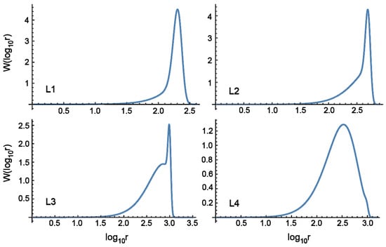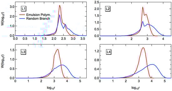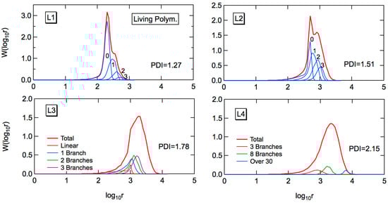 Equation (23) gives the weight fraction distribution of the primary chains in the present model living emulsion polymerization. Figure 6 shows the calculated results for L1 to L4. The characteristics of long tails in the low MW region, including a strange distorted fractional MWD profile for k = 0 of L3 condition in Figure 5, agree qualitatively with the primary chain length distribution shown in Figure 6. Note that the primary chains whose distribution is given by Figure 6 are combined, according to the pertinent emulsion polymerization kinetics, to form the branched polymers whose MWD is shown in Figure 5.