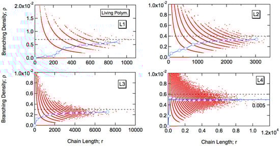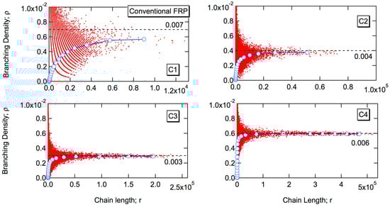 The red curve in Figure 2 shows the MC simulation results for the weight fraction distribution. The independent variable is the logarithm of chain length, as is usually employed for the GPC measurement. The blue curves in Figure 2 show the fractional MWDs consisting of k branch points. The value of k is 0, 1, 2, 3 from the left to the right. For the second high MW peak shown in C2–C4, the large k-value fractions are summed up, as shown in the figure. When the branching probability, Pb is large, a sharp high MW peak appears. In the present condition, the total number of monomeric units incorporated into polymer molecules is, NM = 1 × 106, and therefore, a polymer molecule with log10r > 6 cannot exist in a polymer particle. The sharp high MW peak is formed due to the limitation of the small particle size. A sharp high MW peak essentially consists of the largest polymer molecule in each polymer particle [].