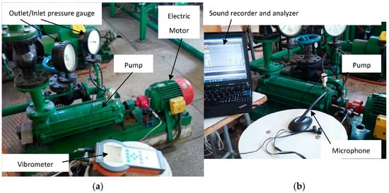 An overview of the pump, motor and sensors positioning is shown in Figure 2. As mentioned, two methods of determining the vibration were used: a vibration velocity transducer (Figure 2a) and a sound level meter (Figure 2b). Both methods manage to capture changes in the equipment working condition, with a better accuracy achieved through the vibration velocity transducer, which is closer to the pump. For incompressible single-phase fluids at a known intake pressure and temperature, the pressure increment developed by a specific stage is a function of the flow rate and the density. For air-water mixtures, the pressure increment of the centrifugal pump stage is directly proportional to the mixture’s fluid density.