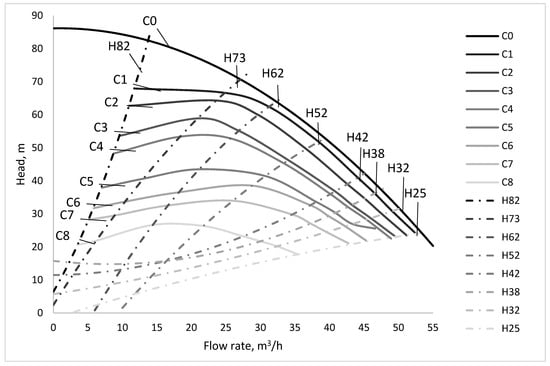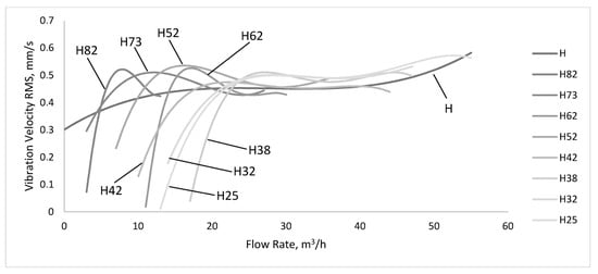 The introduction of air into the water changes the pump characteristic curve, as shown in Figure 3, and the hydraulic performance (flow rate, pump head, pump efficiency) is lower. If we follow a point on the initial characteristic curve, it can be noted that it moves to the left and down (curves noted with C in Figure 3). Changes of a point (from pump characteristic curve) coordinated with the amount of air are accompanied by a modifying level of vibration and sound signature. These are compared with the H curve, representing the recorded vibrations to normal operation at different flow rates (see Figure 4). For example, the transformation of a point of the pump characteristic curve (Q = 14 m3/h; H water = 82 m) in Figure 3, is shown by the curve H82. By reading this curve from right to left, the switch from normal operation can be observed. Initially, the vibration velocities are close to the vibration values at normal operating conditions, shown in curve H. An increase in the amount of air amplifies the vibrations, which are strongest at the flow rate of 7.5 m3/h. This aspect is also maintained in high pressure and low flow scenarios (see lines H73, H62, H52 in Figure 4). The points on the pump characteristic curves H42, H38, H32, H25 (with low pressure and high flow) have initial speeds of vibration slightly higher than at normal operating conditions. The vibration level is almost unaffected by flow rate in the 22–55 m3/h interval. With the reduction of flow, vibrations decrease rapidly as the amount of air becomes important into the mixture, acting as a dampener.