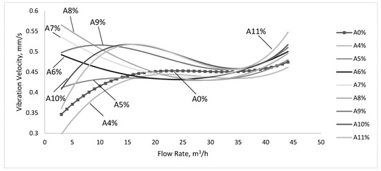 By increasing the flow rate of air (A6%, A7%, A8%), vibration is higher than in normal operation at low flow rates of up to 15–19 m3/h, after which the vibration velocities are constant and under normal operation values. However, the difference is small and we can say that air influx does not influence the pump operating condition. At flow rates above 38 m3/h, the vibration velocities are greater than those of normal operation. The situation is different for the introduction of large amounts of air A9%, A10% and A11%. In all these three cases, the recorded velocities exceeding the normal functioning values and their trend is accompanied by maximum and minimum values for certain flow rates. To conclude, the vibrations intensify with increasing air in the pump at levels above 5% of the nominal pump flow. The influence is strongest at low flow rates (up to 15 m3/h). As we approach the nominal flow rate, differences are reduced. At flow rates higher than 38 m3/h, the values corresponding to the normal operation are increasing again. All in all, the operation at the flow rates that differ from Qn (particularly under 0.6 of Qn and more than 1.2 of Qn), with an amount of air higher than 5% of Qn is characterized by velocities of vibration up to 60% larger, compared to values at normal operating conditions.