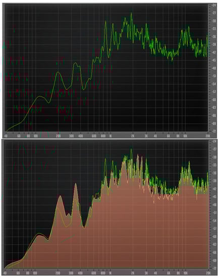 Amplitude and frequencies of sound at normal operating conditions (top); and with air intake (bottom). Green line—no air, red line—with air intake.