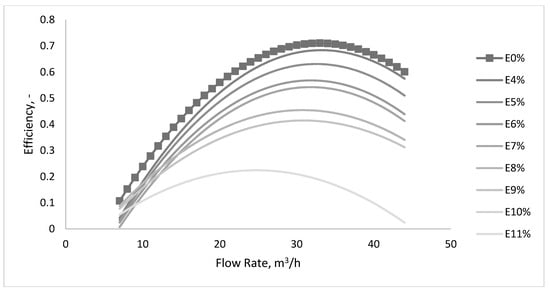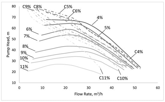 The issue of operating centrifugal pumps with gas-liquid two-phase mixtures has been addressed by many researchers [,,,,,,], as the gas will strongly affect the pump’s operability and reduce the lifetime of the system. One of the main conclusions observed in the studied literature relates to the complexity of the operation under two-phase conditions, particularly detecting when the air content becomes dangerous for the pump. A second one refers to the necessity of using experimental work for assessing the performance of a specific type of pump [,] to determine the equipment state when air entrapment takes place. From a process standpoint, this can be defined as non-standard, since the working parameters will deviate from the standard or expected parameters. A third conclusion refers to the difficulty of finding a general analytical model that explains the changes of the pump characteristic curve [,].
