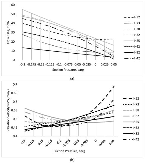 Minggao et al. [] demonstrated that operating at parameters other than designed, especially at low flow rates, leads to an increase in vibration energy. Decreasing the centrifugal pump performance means wasted energy, and the vibration level of the pump is an indicator. A close connection between the flow aspect and the vibration energy can be found in [].