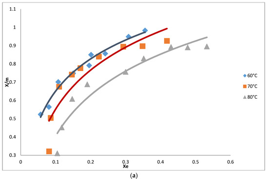 Adsorption isotherms of cotton seed oil on the prepared AC were studied at 60, 70 and 80 °C. Contact time as derived from kinetic studies was 45 min. The relative quantity of pigments adsorbed per gram of adsorbent (X/m) and the quantity of residual pigments (Xe) were estimated from Equations (7) and (8) respectively: