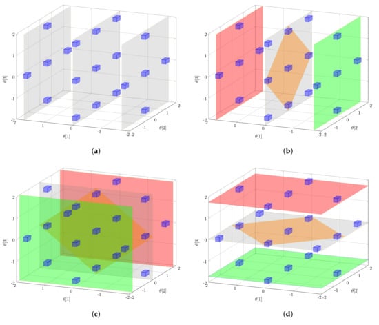 The overall set of generated sample points of the PEM provides nested subsets of sample points representing the conditional variance terms. According to the numerator of Equation (10), the expected value is taken over all but the i-th parameter; i.e., the -value of parameter i is set to zero. The variance, however, is taken exclusively for the i-th parameter; i.e., the corresponding entry is reset to its original distribution-dependent value. Only the weights, and , have to be adapted to a one-dimensional problem while leaving the overall PEM samples unchanged, i.e., there is no need for additional costly simulation runs. Please note the weight is set equal to zero; i.e., sample points generated via are not considered at this point. The described procedure is illustrated in Figure 2 assuming a three-dimensional parameter problem. In Figure 2a, the original sample set generated via Equation (11) is shown. Next, in Figure 2b, three different expected values are determined for via the three differently colored sample subsets and different values, respectively. When using these three derived expected values for , the conditional variance of can be approximated (Equation (10)). The same procedure is repeated for parameter (Figure 2c) and parameter (Figure 2d) to derive the desired Sobol indices. Please note that the derived samples are not used to quantify the information content [,,], but to quantify the uncertainty of the local sensitivities or to directly derive global parameter sensitivities. In [,], the performance of the PEM for calculating global parameter sensitivities and uncertainty analysis is discussed in more detail. Here, the PEM provides appropriate approximations at low computational costs compared to Monte Carlo simulations. In the next step, from these sensitivity measures, the most MB-OED-relevant features have to be extracted by defining proper optimal design measures.