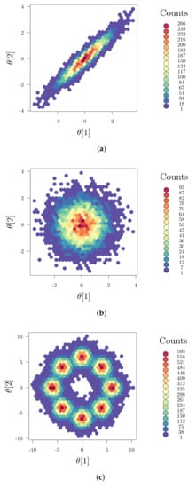 Illustrative example of parameter dependencies: (a) linear correlation with ; (b) no correlation with ; and (c) nonlinear correlation but zero linear correlation (); here, eight standard Gaussian distributions are superimposed in a circular structure and properly rescaled providing a multi-modal density function. (a) linear correlated parameters; (b) linear uncorrelated parameters; (c) nonlinear correlation.