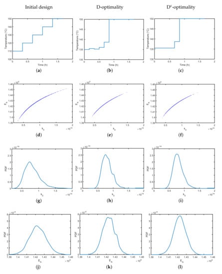 Performance of the initial setting and MB-OED. D-optimality means a simplified temperature profile in comparison to D-optimality. (a) is the initial; (b) the optimally designed; and (c) the optimal but simplified temperature profile; (d–f) are the scatter plots for the estimated parameters assuming simulated noisy data for 2000 MC simulations; (g–l) are the corresponding parameter probability distributions.