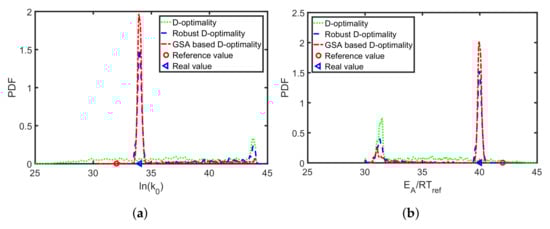 The results show that a misspecification of the applied reference Arrhenius parameters is likely to result in sub-optimal temperature profiles, less informative measurement data, and higher parameter uncertainties. Alternatively, when the multi-point averaging approach is used (Equation (8)), the calculated design is more robust against reference parameter variations; see Figure 6b. The classical D-optimality shown in Figure 6a degrades drastically with reference variations. The robust D-optimality, however, shown in Figure 6b is less affected by changing the reference parameters. As the reference parameters are typically unknown but are needed to calculate local parameter sensitivities, a robust MB-OED strategy is expected to provide more valuable MB-OED results. Moreover, global parameter sensitivities are evaluated and used for a more credible D-optimality measure (Table 4). The resulting parameter errors for the classical D-optimality, its multi-point averaging realization, and the global sensitivity-based D-design are analyzed. In Figure 7, the multi-point averaging approach and the GSA-based MB-OED lead to more precise parameter estimates in comparison to the classical D-optimality as indicated by the density functions. Here, the GSA-based design results in the most precise estimates; i.e., the probability density functions of Arrhenius parameter have their highest peak close to the true values. Moreover, the multi-point averaging approach and the GSA-based design seem to be less corrupted by the misleading second local minima of the parameter identification problem, which is indicated by the second peak of the probability density functions in Figure 7a,b. Please note, because the proposed PEM sampling strategy is used, only nine sample points for each iteration of the optimizations step are needed to calculate the multi-point averaging or GSA measures in the case of the two Arrhenius parameters.